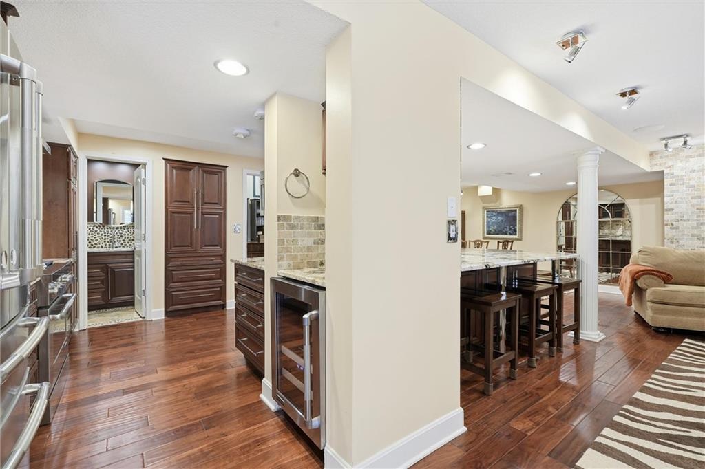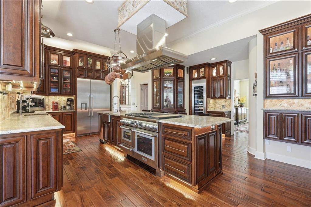Exceptional luxury living awaits in Nottingham by the Green. Tucked on a quiet cul-de-sac, this updated residence offers 5 bedrooms plus nursery/office, 5.1 baths, four living areas, and two full kitchens, making it ideal for entertaining, multigenerational living, or extended guest stays. The home features laundry on each level, abundant storage, and custom built-ins throughout. The main-level gourmet kitchen is a showpiece, featuring high-end appliances, dual dishwashers, dual-fuel range with grill and griddle, steam oven, built-in refrigerator and freezer towers, wine refrigerator, trash compactor, two sinks with instant hot water, walk-in pantry, custom cabinetry, and granite counters with stone accents. A spacious eating area adjoins the kitchen and hearth room. The home offers four bedrooms upstairs and two sleeping areas in the basement, one serving as a secondary primary suite and an additional flex room. There is also a built-in Murphy bed in the living area. All bathrooms have been updated, featuring heated tile floors in both primary baths, towel warmers, custom vanities with granite, and thoughtful details throughout. The finished walkout basement functions as a home of its own, complete with living and dining areas, full kitchen with professional appliances, gas fireplace, engineered wood and tile flooring, laundry room, specialty vented exterior doors, and abundant storage, including plumbed unfinished utility space. The oversized side-entry garage offers extra depth, epoxy floors, insulated carriage doors, insulated walls/ceiling, smart openers, overhead storage, insulated attic, ceiling fans, and exceptional functionality. The exterior is equally impressive, with elegant stone and stucco finishes, expansive windows, and multiple outdoor living areas. The property sits on a meticulously landscaped lot with mature trees, manicured gardens, and lush green spaces. Enjoy the spacious patio and room for entertaining or relaxing outdoors.