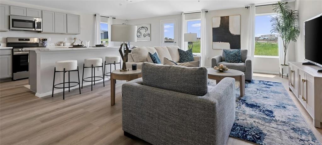 Designed with both style and functionality in mind, this single-level home showcases an open-concept layout where the kitchen, living, and dining areas come together and extend effortlessly to an outdoor patio. The private bedroom wing includes three bedrooms, highlighted by a serene owner’s suite at the rear of the home featuring a full bath and walk-in closet. Photos are of a completed home. The color samples are what was chosen for this home's finishes. LEVEL, CORNER HOMESITE BACKING TO TREES!