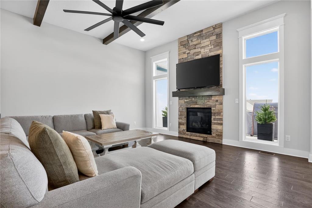 Tucked away on a quiet cul-de-sac, this gorgeous ranch style home has so much to offer! Step inside to an open-concept great room that instantly wows—wood beams overhead, a floor-to-ceiling fireplace stealing the show, and sunlight pouring in. The heart of the home? A dream kitchen featuring beautiful countertops, stainless steel appliances, a walk-in pantry, and a generous island that’s ready for morning coffee, homework sessions, and perfect for entertaining. The dining area flows effortlessly onto an extended covered deck overlooking a fenced backyard—perfect for summer dinners and crisp fall evenings, and has extra room for the grill. Your primary suite is a retreat of its own with a tray ceiling, spacious walk-in closet, and private on-suit that is boasting double vanities and a sleek tile shower. A second bedroom, a full bath, laundry, and mudroom round out the main level—because convenience is key. Downstairs, the finished walkout lower level is made for fun with a huge family room, wet bar, third bedroom, and full bath—hello movie nights, game days, and guests who won’t want to leave. All this in a prime location close to highways, shopping, and dining. This one checks every box and then some!