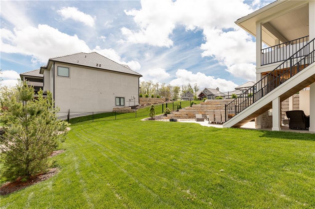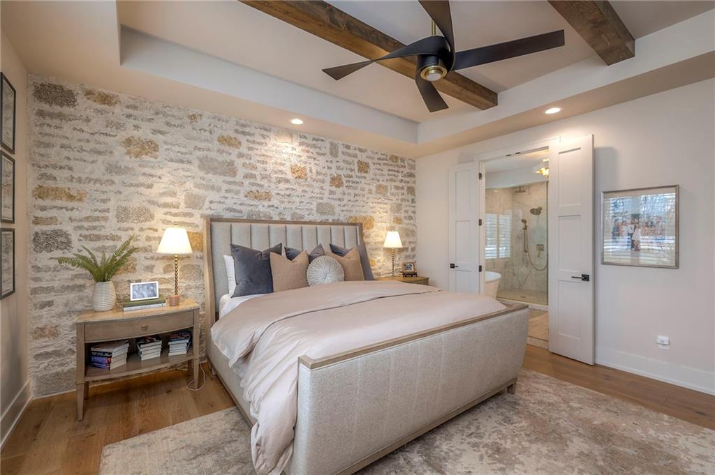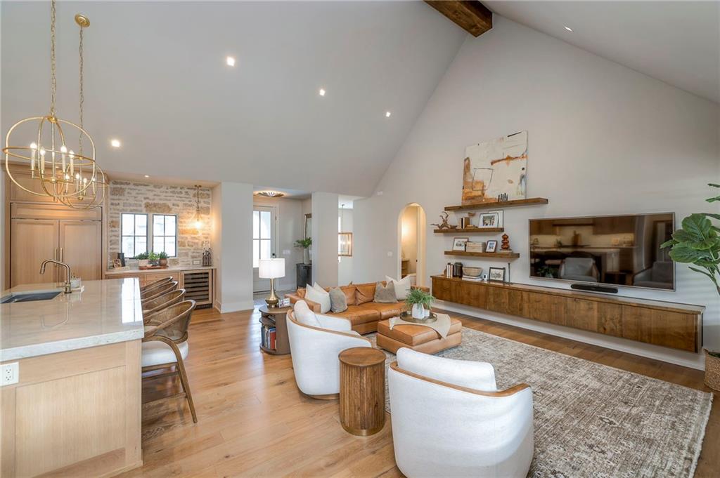 Welcome to this stunning, thoughtfully designed home where elevated finishes and exceptional entertaining spaces come together beautifully. The dramatic living room showcases soaring 18-foot ceilings, custom built-ins, and charming arched fireplace, all complemented by wide-plank hardwood flooring that flows seamlessly throughout the main living areas. Plantation shutters throughout the home and elegant arched doorways add timeless architectural character, style, and privacy. The designer kitchen is both sophisticated and functional, featuring a gas range, quartzite countertops, striking stone feature wall, wine fridge, and abundant workspace for everyday living or hosting. Just off the kitchen, a spacious butler’s pantry provides additional storage and convenience, complete with a second oven, making entertaining effortless. The kitchen opens directly to a large covered deck with low-maintenance Trex decking, creating the perfect indoor-outdoor connection. The luxurious primary suite is a private retreat, highlighted by a beamed ceiling and stone feature wall, and complemented by a spa-inspired bath offering LED mirrors, quartzite countertops, a soaking tub, and an oversized walk-in shower. The laundry room is conveniently located just off the primary suite for added everyday ease. The walk-out lower level is designed for unforgettable gatherings, featuring a media room and an impressive entertaining bar with waterfall-edge quartzite countertops, microwave, drink fridge, and wine fridge. Step outside to the patio, partially covered for year-round enjoyment, complete with a see-through stone fireplace and hot tub, creating an inviting outdoor living space perfect for relaxing or hosting guests.