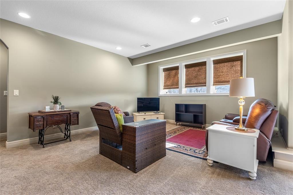 Don't miss out on this home in The Greens at Prairie Highlands - located in one of the area’s most sought-after golf course communities, just minutes west of Lake Olathe. This former model home is filled with thoughtful upgrades and timeless style. The popular reverse ranch floor plan offers an open-concept layout connecting the living room, kitchen, and dining area, perfect for everyday living and entertaining. The kitchen features a center island, pantry, pull-out drawers, and abundant cabinetry, while the stone fireplace and accent wall create a warm, inviting focal point in the living space. The spacious primary suite includes a spa-like bathroom with dual vanities and a soaking tub, conveniently connected to the laundry room. 2nd bedroom/office is also located on the main floor. Start your mornings on the covered deck overlooking peaceful green space and visiting wildlife. The finished lower level family room is ideal for entertaining. Additional features includes two bedrooms, full bath, plenty of storage and walkout/walkup access to the backyard. A three-car garage, in-ground auto drain sprinkler system, and close proximity to the community pool bring comfort and ease to everyday living. Residents enjoy access to the community pool, neighborhood activities, and Crush Restaurant at the Prairie Highlands Golf Course Clubhouse - open to the public. Golf course play requires membership. A single-owner home, thoughtfully maintained and ready to be enjoyed by its next owner.