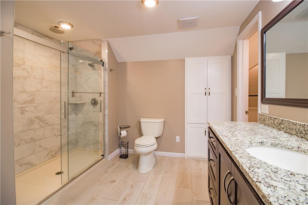 Enjoy the private and scenic feel while having centrally located convenience! This beautiful brick front home is nestled on a large treed lot that offers charm with modern updates. You will enjoy cozy nights around the brick fireplace located in the spacious living room on the main level. The semi-open floor plan is perfect for hosting and entertaining in the substantially sized kitchen and dining area. The kitchen includes beautiful wood cabinets, granite countertops, a kitchen island, stainless steel appliances including a double oven, and more cabinet space than you could need. The sizeable primary bedroom features a bump-out with a large window for plenty of natural light. The primary bedroom is equipped with an ensuite bathroom with ample space, a generously sized vanity, large stand up glass shower with beautiful tile, whirlpool bathtub and spacious walk-in closet. The finished basement offers a family room with another brick fireplace, a bedroom, full bathroom, unfinished storage space, and garage access. The fenced-in backyard provides a picturesque scenery and is perfect for pets.