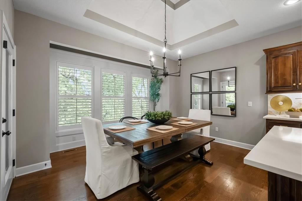 Welcome home to effortless comfort and quiet luxury in this lightly lived-in former Rodrock model home (Dillon Reverse), beautifully set on a private wooded walk-out lot. The open floor plan invites you in with gleaming hardwoods, a beamed great-room ceiling, and a cozy two-sided fireplace perfect for gatherings. A chef’s kitchen shines with quartz countertops, stained cabinetry, stainless steel appliances, and an oversized walk-in pantry, while the main-level bedroom offers flexibility as a guest suite or home office. The serene primary suite features peaceful backyard views, a spa-like bath with whirlpool tub, separate shower, dual vanities, and a walk-in closet connected to the laundry room. Entertaining is effortless in the expansive lower level with a wet bar, family room, and two private ensuite bedrooms. Outdoor living is highlighted with a covered deck and see-through fireplace plus a covered patio overlooking tranquil trees and wildlife. Thoughtful updates include fresh interior and exterior paint, plantation shutters throughout, new quartz kitchen counters, updated lighting, deck extension, and refreshed landscaping. Nestled in a secluded hilltop neighborhood with no neighbors behind - yet minutes from Shawnee Mission Parkway shopping, dining, and award-winning DeSoto schools - this home is ready to impress.