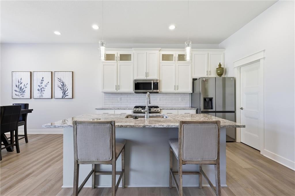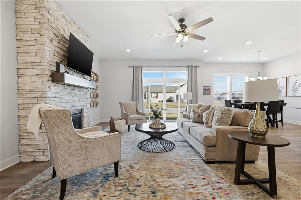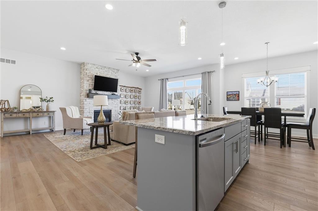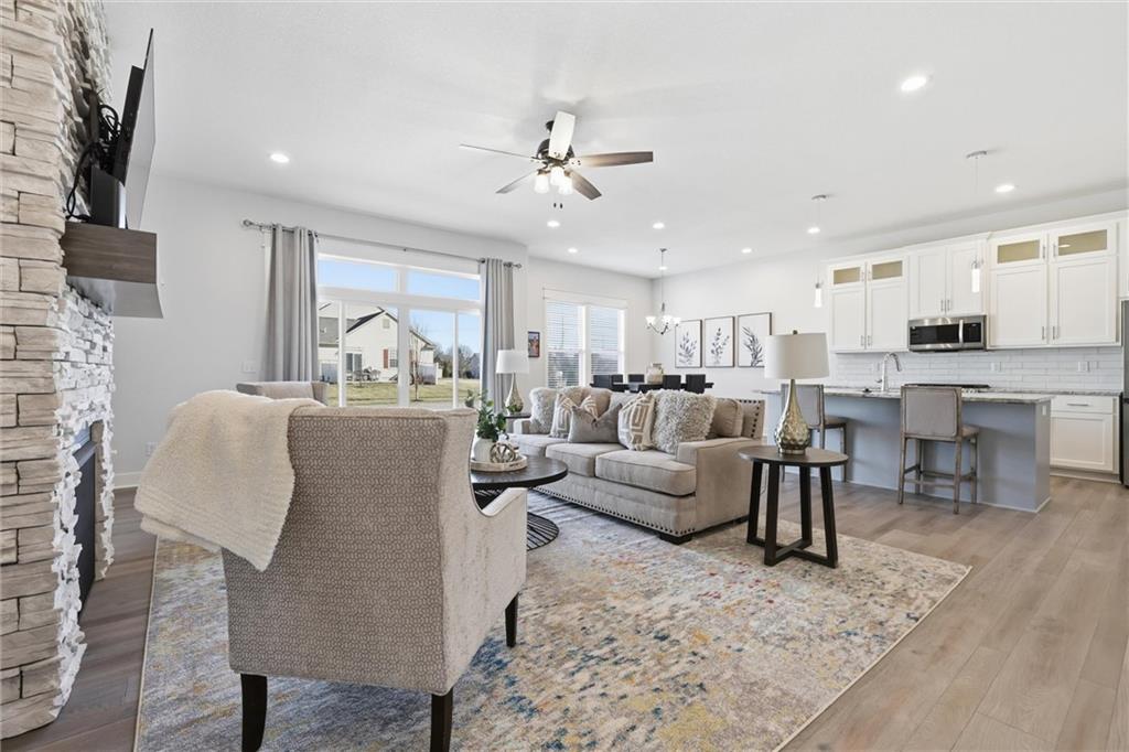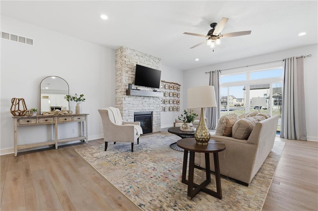 Completed in 2023, this light-filled, maintenance-provided reverse 1.5-story villa shows like new and offers nearly 3,000 square feet of living space. The main level features two bedrooms, two full bathrooms, and convenient main-floor laundry. The finished lower level includes two additional bedrooms, a third full bathroom, and an expansive recreation room, providing excellent space for entertaining or guest accommodations. Beautiful hardwood flooring extends throughout the main living areas, complemented by tile flooring in all bathrooms and the laundry room. The spacious living room showcases a stunning floor-to-ceiling stone fireplace and flows seamlessly into the kitchen, which features granite countertops, custom cabinetry, stainless steel appliances including a gas range and refrigerator, a walk-in pantry, and a large center island with built-in shelving. The primary ensuite offers gorgeous tile, dual vanities, and a large shower, while impressively sized walk-in closets provide abundant storage. The exterior showcases stucco with stone wainscoting surrounding the entire home, delivering exceptional curb appeal. Community amenities include a swimming pool, play area, walking trails, and pickleball court. Conveniently located near Cedar Niles Park, shopping, dining, and easy highway access just minutes away, this exclusive maintenance-provided villa community offers a carefree lifestyle.
