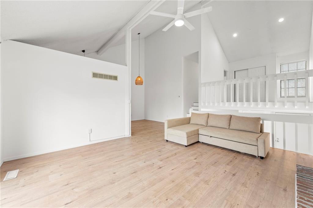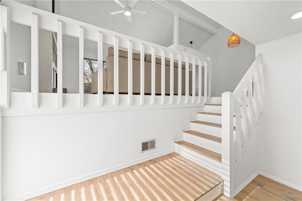 This townhome in The Trails features soaring vaulted ceilings, a seller-updated kitchen and bathrooms, new flooring, and a 2-car garage! Enjoy a private patio with a six-foot privacy fence and an unfinished basement—perfect for storage or to finish and add value. The kitchen opens to an inviting family room highlighted by a beautiful masonry fireplace. The loft overlooks the main level and works perfectly as a home office, workout space, or both, and could easily be enclosed to create a third bedroom. Located on a quiet cul-de-sac close to schools, shopping, and restaurants. Community amenities include walking trails, a swimming pool, and tennis courts for easy, low-maintenance living. Schedule your showing today!