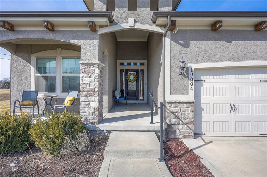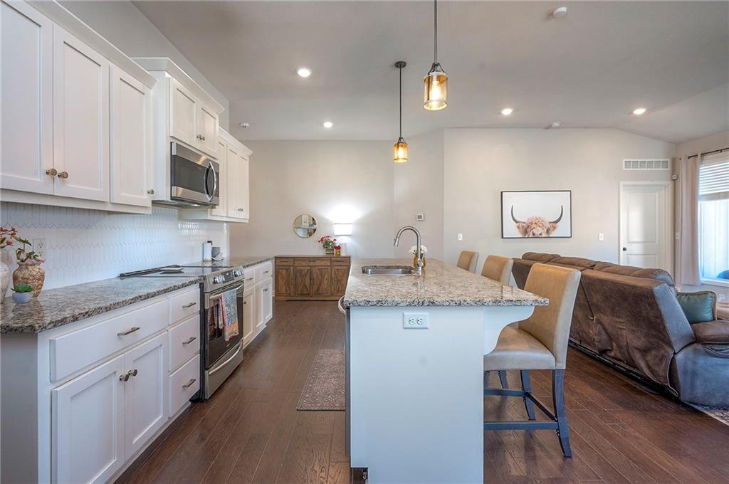 Beautiful ranch in Foxwood Ranch featuring an open floor plan with all 3 bedrooms conveniently located on the main level. The luxury kitchen showcases painted cabinetry, granite countertops, tiled backsplash, wood floors that flow through the kitchen, dining area and great room, plus upgraded brushed nickel plumbing fixtures for a modern touch. Enjoy outdoor living on the 14x10 covered patio with an extended stamped concrete patio, and irrigation system. Maintenance-provided living covers lawn care, fertilizer treatments, sprinkler system maintenance and snow removal. Additional highlights include a 3-car garage and a prime location just 10 minutes to Garmin or I-35, minutes to Sycamore Ridge Golf Course and Hillsdale Lake, and just a few blocks to Wolf Creek Elementary and Spring Hill High School. Community amenities include a state-of-the-art pool, clubhouse, playground and scenic trails — offering comfort, convenience and low-maintenance living all in one. Basement is ready for your design as it includes an egress window and is stubbed for a bathroom.