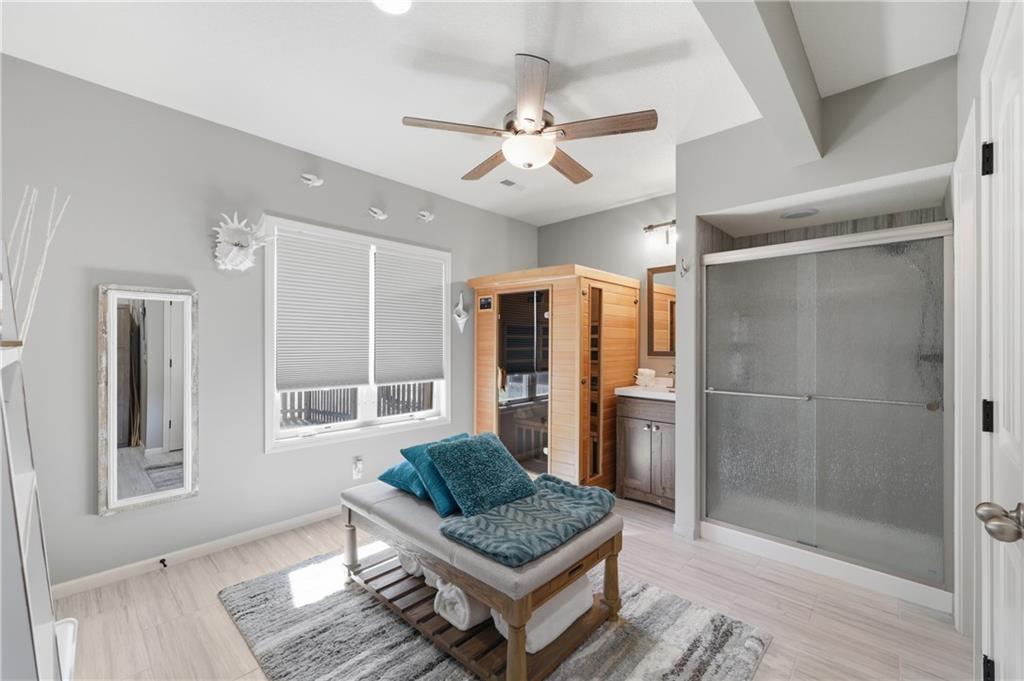 This beautifully maintained, custom-built Reverse 1.5 Story home sits on a quiet cul-de-sac and exudes curb appeal, elegance, and thoughtful upgrades throughout. Built in 2013 with no expense spared, it offers warm, inviting spaces with timeless finishes, rich hardwood floors, custom wood trim, and soaring ceilings that create an elegant yet comfortable feel from the moment you step inside. The spacious living room is filled with natural light and features a see-through fireplace shared with the covered deck — perfect for enjoying indoor-outdoor living. The open layout flows seamlessly into the kitchen with a large island and adjoining dining area, where classic lighting and generous windows create an ideal setting for everyday living or entertaining. The private primary suite is a true retreat, complete with tray ceilings, abundant light, and ample space to unwind. The en suite bath offers a double vanity, custom shower, oversized tub, and a walk-in closet with built-ins and private hallway access. The lower level is an entertainer’s dream with a custom theater-inspired vibe and room to gather. The expansive rec area features stained concrete floors and space for a pool table, shuffleboard, and more, along with a dedicated theater room for movie nights at home. A standout wet bar showcases stone accents, glass-front cabinetry, pendant lighting, and bar seating — complemented by a cozy lounge area for relaxing. Throughout the home, you’ll appreciate the warm color palette, solid wood doors, and well-designed living spaces where comfort and character blend beautifully. This is truly a special home you won’t want to miss!
