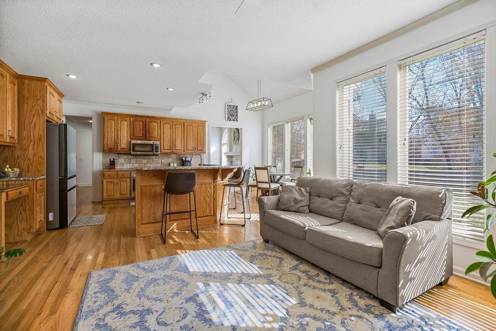 This beautiful 1.5-story home offers 4 bedrooms, 3.5 bathrooms, two fireplaces, a three-car garage, and over 2,700 finished square feet—perfectly situated at the end of a cul-de-sac in the highly sought-after Blue Valley School District. Designed for convenient main-level living, the first floor features the primary suite, great room, formal dining room, kitchen, breakfast room, hearth room, and laundry room. The great room showcases a stunning floor-to-ceiling fireplace mantel and a wall of windows that fill the space with natural light. The formal dining room includes a charming hutch bump-out and blinds. The kitchen offers stained cabinetry, granite countertops, a center island, pantry, and built-in desk area. Just off the kitchen, the breakfast room features vaulted ceilings, hardwood floors, and direct access to the backyard. The hearth room provides a cozy second fireplace, hardwood flooring, and blinds—creating the perfect gathering space. Hardwood floors extend through the entry, kitchen, hearth room, breakfast room, and half bath, complemented by impressive 10-foot ceilings on the main level. The main-level primary suite includes a vaulted ceiling, walk-in closet, and double doors leading to the patio. The en-suite bath features a jetted corner tub, tile flooring, and double vanities. Upstairs, you’ll find three additional bedrooms plus a loft overlooking the breakfast room, complete with vaulted ceilings, skylights, and a ceiling fan. Step outside to enjoy the back patio—perfect for relaxing or entertaining—overlooking a partially fenced backyard with space to play, garden, or unwind. In-ground sprinklers! Located in the desirable Wakefield Estates community, this home is all about location, location, location—close to parks, shopping, dining, and with quick access to 69 Highway, I-435, and I-35. Residents also enjoy access to the neighborhood pool! A rare opportunity in an unbeatable location—this home truly checks all the boxes!