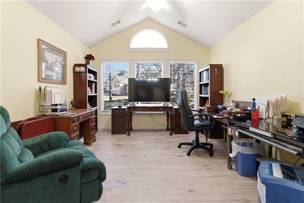 BEAUTIFULLY MAINTAINED AND MOVE IN READY RANCH HOME IN THE HIGHLY SOUGHT AFTER ST JAMES COURT, A DESIRABLE MAINTENANCE-PROVIDED COMMUNITY! This impeccably kept residence offers convenient one-level living with 2 bedrooms, 2 bathrooms, and a 2-car garage. The open floor plan features a spacious living room with vaulted ceilings, a cozy fireplace, and hardwood floors. Large windows flood the home with natural light and highlight views of the tree-lined lot, offering a peaceful setting with exceptional privacy. One of the standout features of this home is the fully finished sunroom, thoughtfully updated to create the perfect space for year-round enjoyment. Whether used as a morning coffee retreat, reading nook, office or hobby space, or additional entertaining area, this bright and inviting room adds both versatility and valuable living space. The vaulted owner’s suite offers a relaxing escape with a double vanity, separate shower and soaking tub, and a generous walk-in closet. Located in the award-winning Blue Valley School District, residents enjoy maintenance-free living with access to a neighborhood pool and scenic walking trails. Whether you’re looking to downsize, simplify, or enjoy carefree living, this home offers the perfect blend of comfort, lifestyle, and location. Schedule your private showing today—homes like this don’t last long!