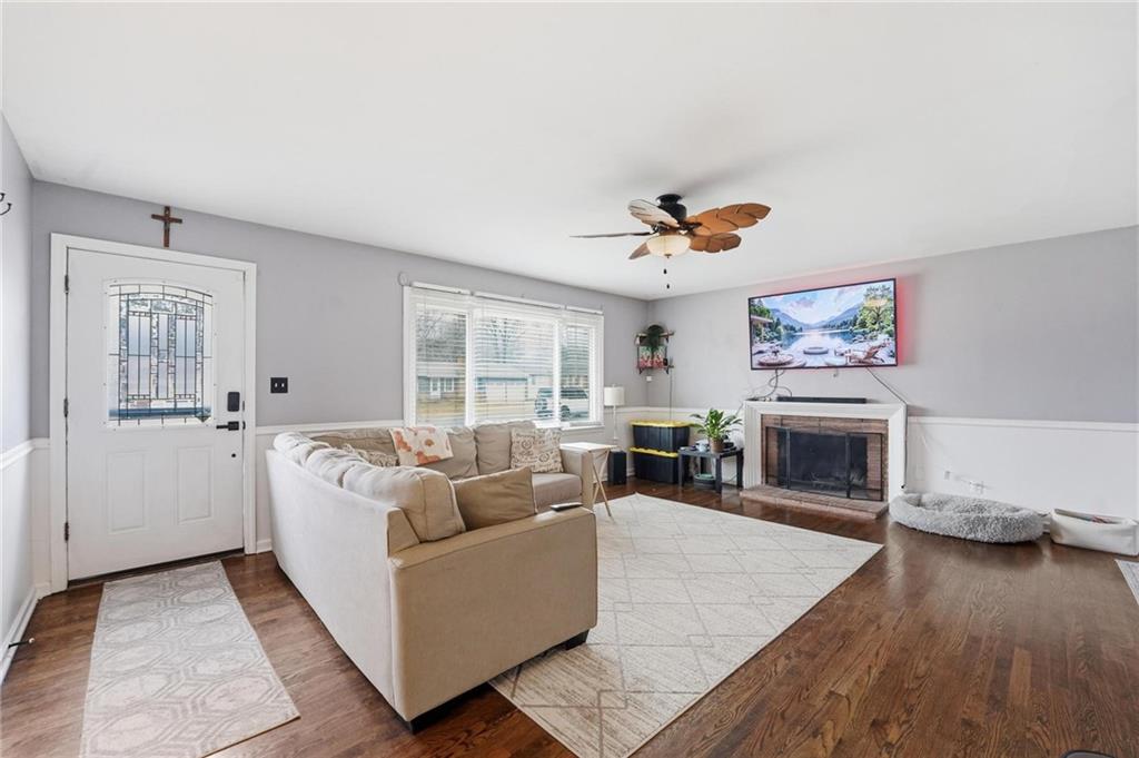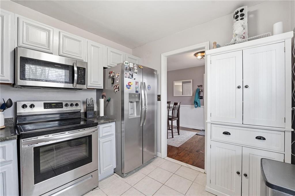 Warm and welcoming 3-bedroom ranch with 2 full baths, spacious 2-car garage. A convenient door from garage opens to a large, level, fenced backyard, featuring a partially covered patio area, bricked around the edges and perfect for quiet mornings as the sun rises, evening gatherings without the heat of the sun, or simply relaxing outdoors. A separate back door leads into the home. Inside, the original 1956 hardwood floors add timeless character and mid-century charm throughout. You'll find a comfortable, spacious living room, a dedicated dining area and an updated kitchen with brand new appliances and painted cabinets The washer and dryer stay, adding to your convenience. The three bedrooms, one a primary with full bath, complete the main level in this charming home. The lower level offers over 500 additional finished square feet of living space, including a welcoming family room and a non-conforming fourth bedroom, perfect for guests, a home office or a hobby space. All upstairs windows have been replaced recently, adding natural light and efficiency. Owner also added new railing to the front entrance.
