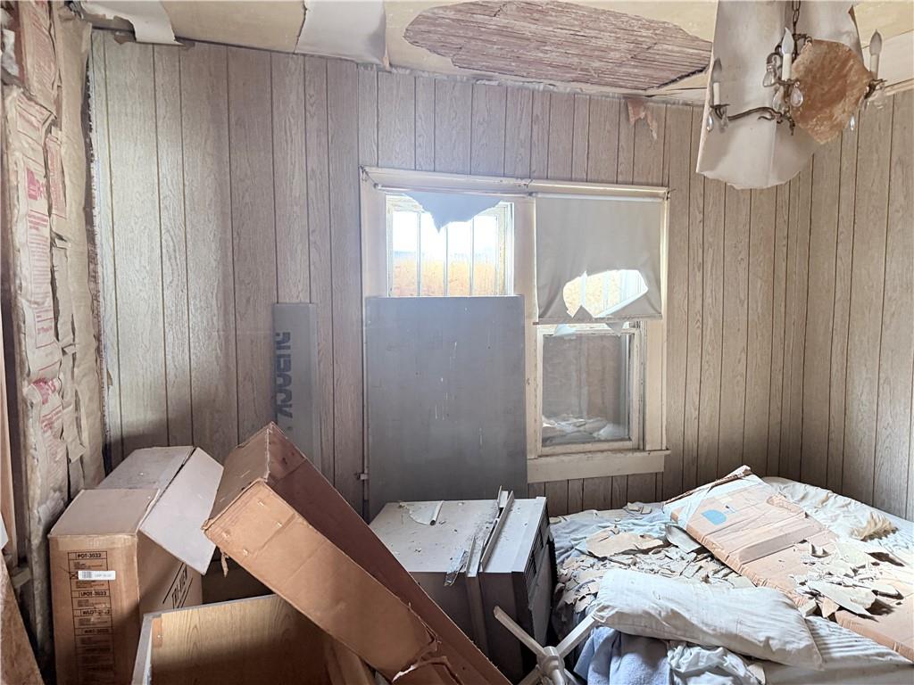Bedroom featuring wood walls