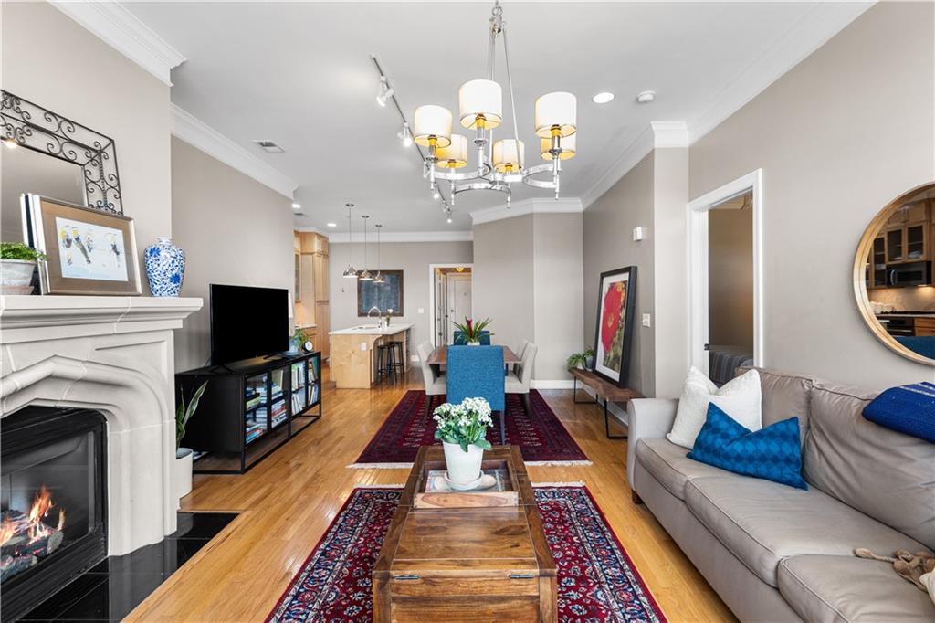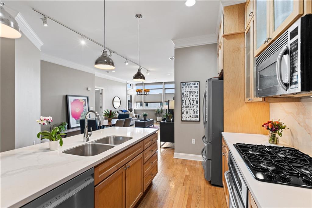 Enjoy elevated city living in the vibrant Union Hill neighborhood—where convenience, culture, and comfort come together effortlessly. From the moment you step out of the beautifully appointed lobby of the historic Greenlease Cadillac building, you’re just moments from Crown Center, the Crossroads Arts District, and the streetcar—putting the very best of the city right at your doorstep. This thoughtfully designed two-bedroom residence features an open, light-filled floor plan perfect for both everyday living and entertaining. The updated kitchen flows seamlessly into the dining and living areas, highlighted by rich hardwood floors, a cozy gas fireplace, and elegant electronic window shades that offer both natural light and privacy at the touch of a button. Step outside to your own private covered terrace—an ideal retreat for morning coffee or evening relaxation. The spacious primary suite offers a versatile nook, perfect for a home office or serene sitting area. Unwind in the spa-inspired bathroom, complete with a large jetted soaking tub, walk-in shower, and timeless subway tile finishes. Additional perks include secure garage parking, extra storage for seasonal items, low HOA dues, and the remaining benefit of a 50% tax abatement—making this not just a beautiful home, but a smart investment. If you’ve been looking for effortless urban living with style and substance, this is the one.