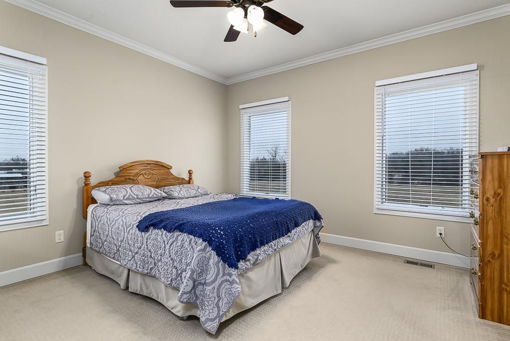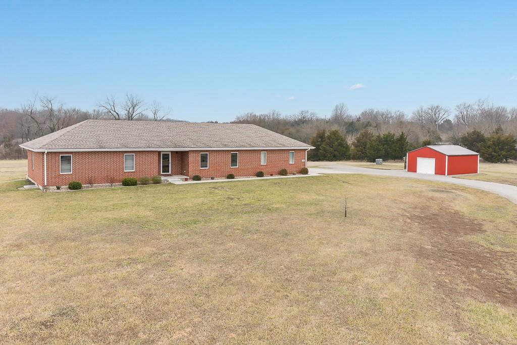 IMMACULATE 3-BED 2-BATH ALL BRICK RANCH ON 6 ACRES WITH UNFINISHED BASEMENT AND EXTRA GARAGE SPACE! This move-in ready country home features hardwood floors in the kitchen and dining room, a beautiful kitchen with quartz counters, and a large living room with upgraded carpet throughout the main living areas. The main-level laundry room adds everyday convenience. The primary bedroom suite offers his-and-her walk-in closets and a private bath with double vanities and a large walk-in shower. The full basement is unfinished but already stubbed for a full bath, giving you room to expand. Outside, you’ll appreciate the detached 20x25 garage for extra storage or workspace, all-brick construction, paved roads, and natural gas service. Both the peaceful 6-acre setting and the easy access to highways and the city make this property a great fit for buyers who want country living without giving up convenience.