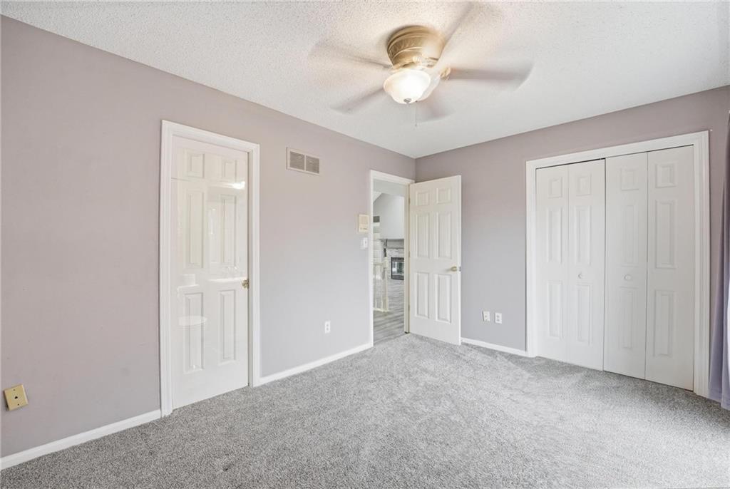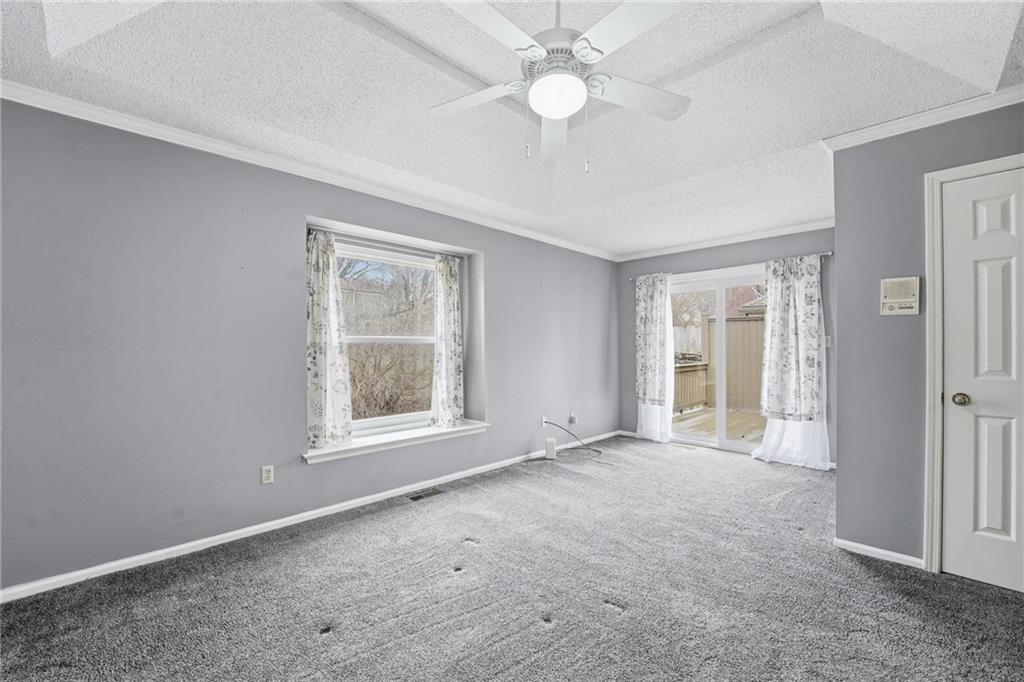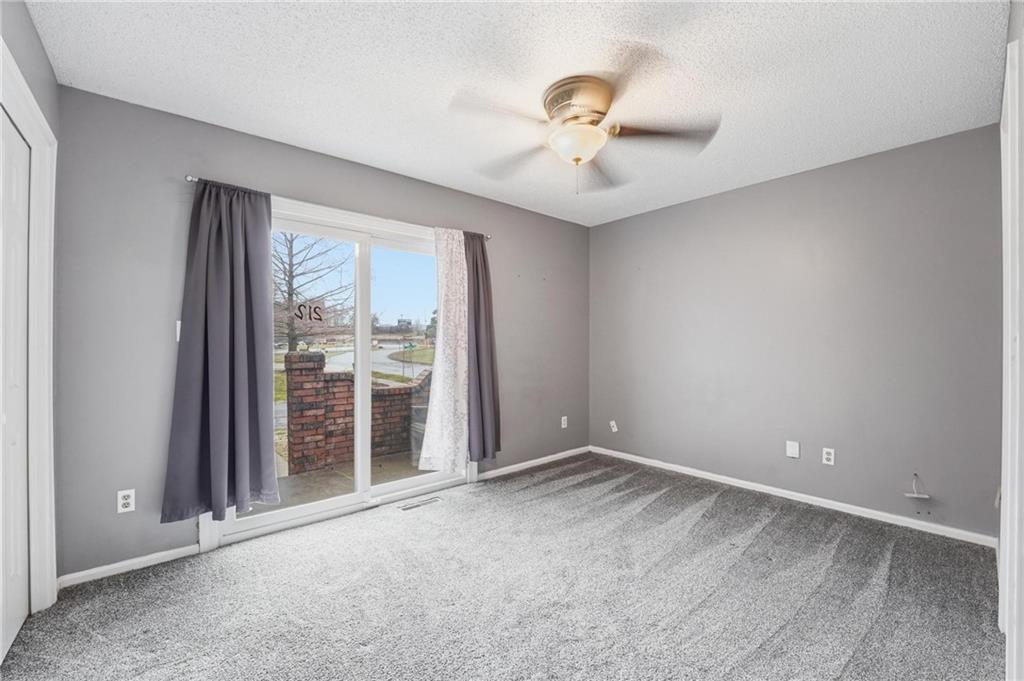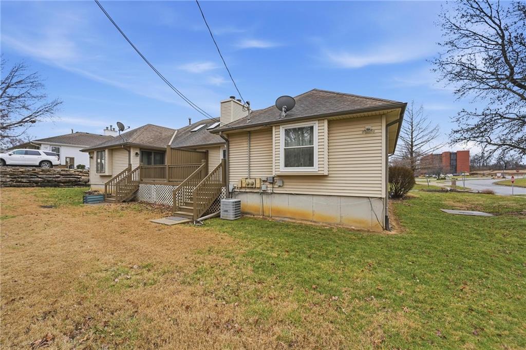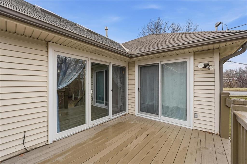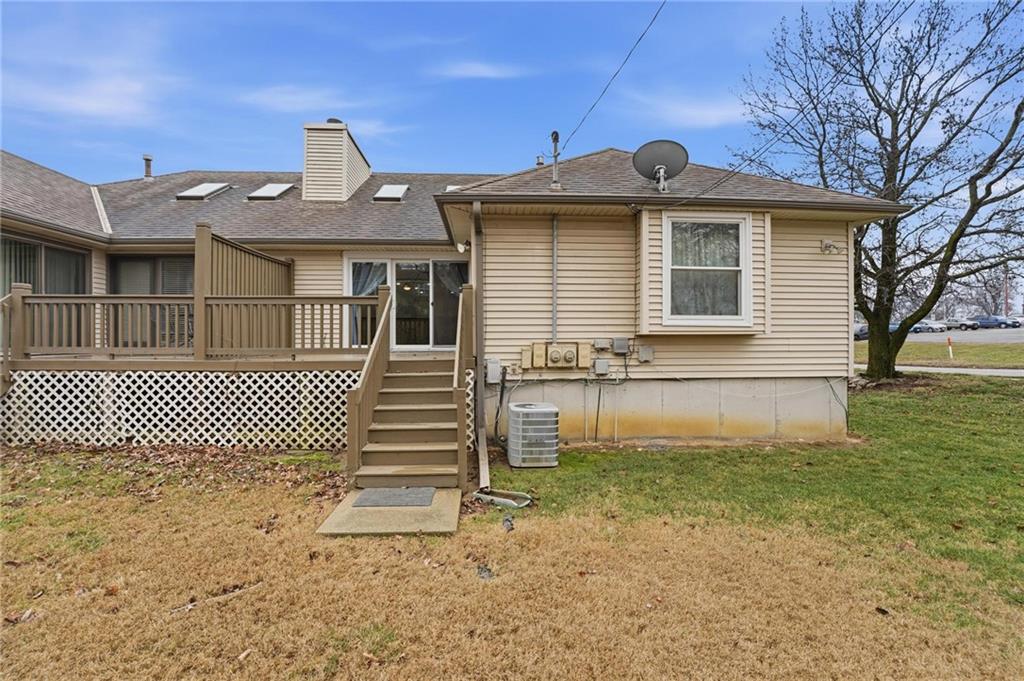Enjoy easy main-level living in this beautifully updated ranch-style corner lot condo featuring 2 bedrooms and 2 full baths on the main floor and a flexible finished basement with a non-conforming spacious 3rd bedroom. Updates throughout the past 10 years—including new windows and doors in the last 2 years—offer peace of mind and modern comfort. The semi-open floor plan is perfect for everyday living and entertaining. The kitchen opens to the main living area with two-tier bar seating and flows into the eat-in dining space and vaulted living room. Relax by the cozy fireplace or step through the sliding doors to a private deck—also accessible from the primary bedroom for a peaceful morning coffee or evening retreat. The generous primary suite features sliding door access to the deck, charming window bench seating, French doors to the spacious primary bath, double vanity, whirlpool tub, walk-in shower, and a large closet. The second main-floor bedroom connects to the hall bath via a pocket door and offers sliding door access to a semi-private front porch, plus a convenient laundry chute. Laundry hookups are also available in the hall closet if you prefer to bring laundry back to the main level. The daylight basement adds even more living space with a large non-conforming third bedroom, family room with built-ins, and a versatile bonus room ideal for a hobby space, workshop, or creative studio. This area includes linoleum flooring, water hookup access, and abundant electrical outlets. Enjoy the attic fan in the Spring to air out the home. Wait, there is more! The refrigerator, washer, and dryer remain with the home. Conveniently located with quick access to 291, I-70, and 435, making commuting and daily errands easy. Comfortable, flexible living in a great location! Measurements approximate.