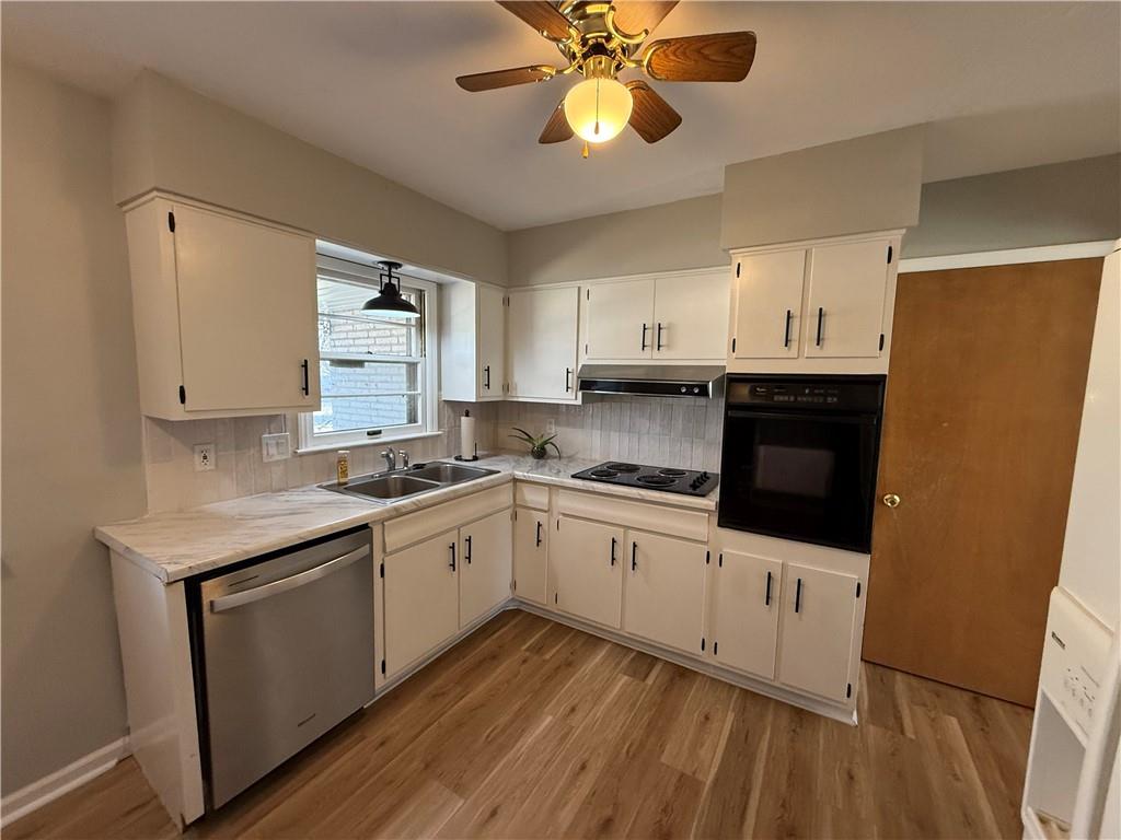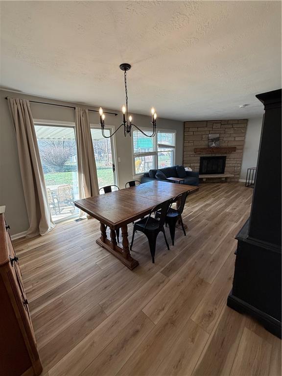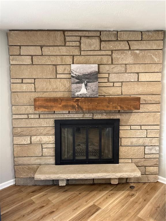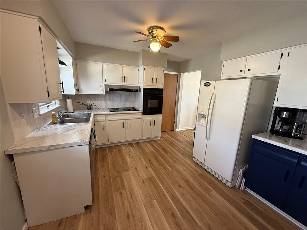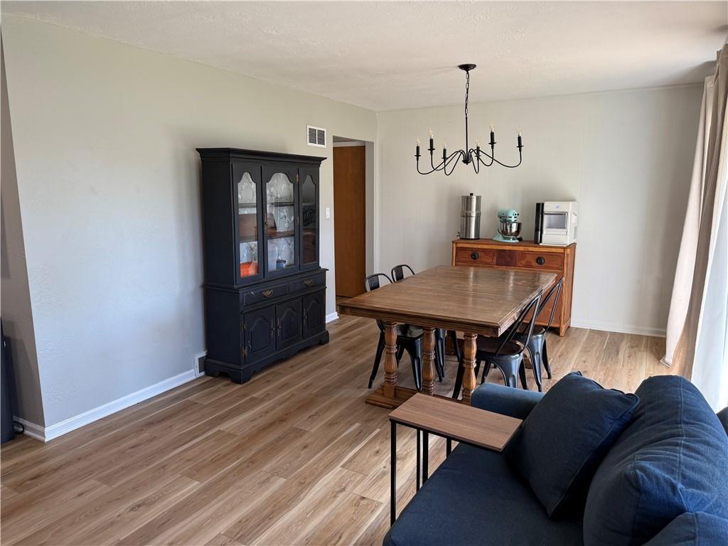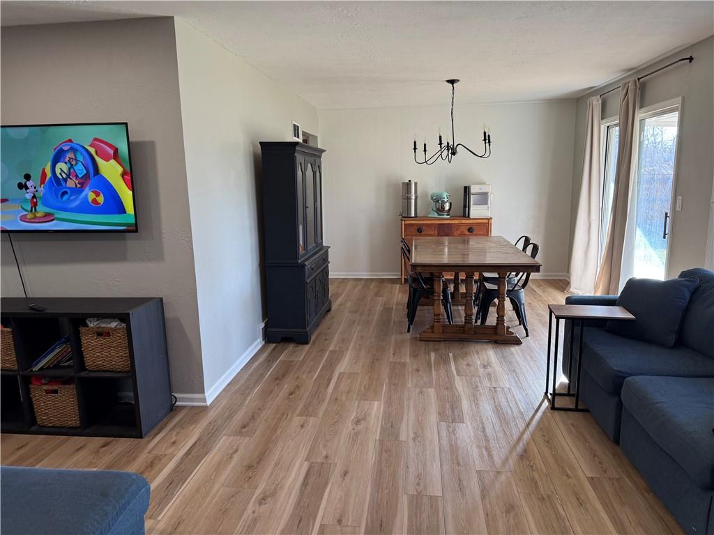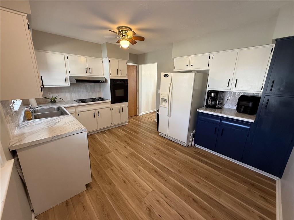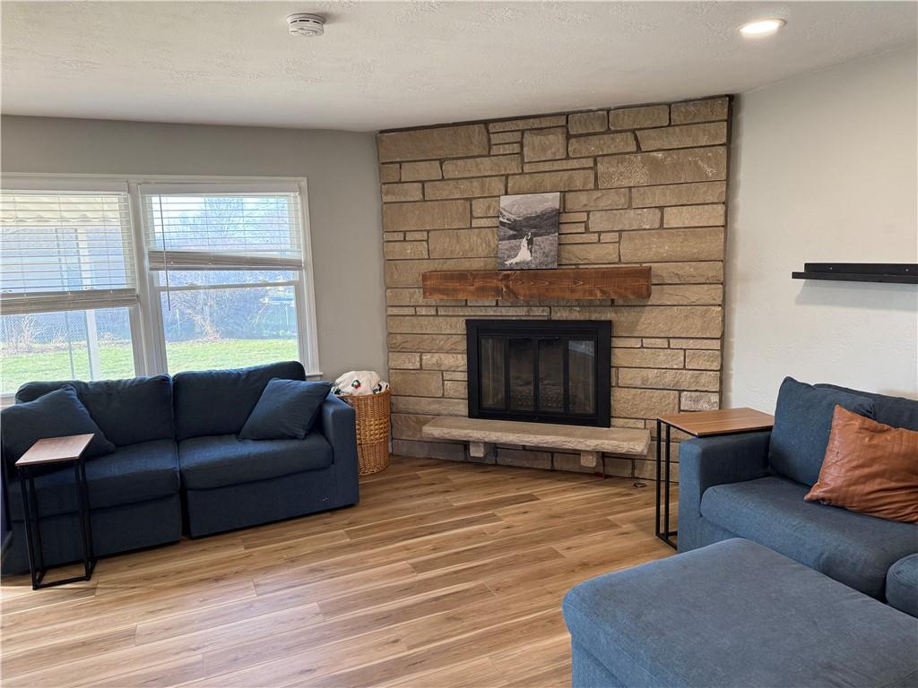 This classic corner ranch is ideally located in the heart of Blue Springs, within walking distance to local parks and downtown amenities. Enjoy outdoor living with a privacy-fenced backyard and covered patio, perfect for relaxing or entertaining. The inviting front porch provides a great space for seasonal décor or simply enjoying the shade. Inside, the home features a bright and open dining and great room combination, filled with natural light and highlighted by an oversized stone fireplace. The kitchen includes painted cabinetry, new luxury flooring, and updated light fixtures. The interior has been freshly painted within the last two years. Many new interior lights have been replaced. Recent updates provide peace of mind, including: New hot water heater (within 2 years) Roof approximately 7 years old HVAC approximately 8 years old Sewer line recently replaced with a 10-year warranty. Hardwood floors remain beneath the new flooring throughout the home. The full basement offers additional potential and is stubbed for a half bath. Laundry is conveniently located both in the basement and in the 3rd bedroom closet. The exterior features durable steel siding with a brick front, contributing to excellent energy efficiency and low utility costs. Oversized garage has a cedar closet. A wonderful opportunity to own a well-maintained home in a great location!