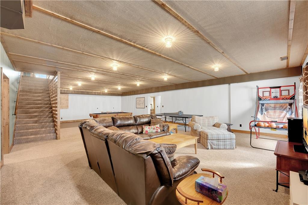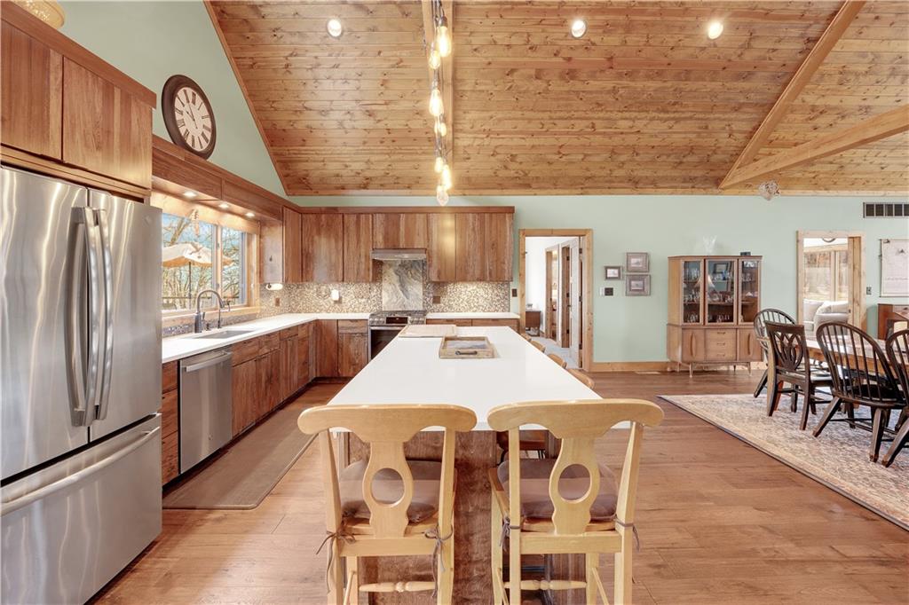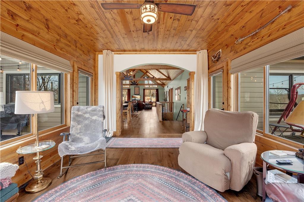 Indulge in waterfront living on approximately 5 serene acres at the 75 mile marker of Lake of the Ozarks. This custom-built home seamlessly blends luxury, Amish craftsmanship, and natural beauty, offering 4 bedrooms and 3.5 bathrooms designed for comfort and style. Very economical to heat and cool with geothermal system. Step into the open-concept main living area, where soaring vaulted wood ceilings with exposed beams, rich wood flooring, and walls of windows frame breathtaking views of the surrounding landscape. The gourmet kitchen is a chef’s dream, featuring a 9-foot island with seating, quartz countertops, custom cabinetry, mosaic tile backsplash, stainless steel appliances, and a walk-in pantry. Focus on work in your own home office or Relax in the sunroom or step outside to enjoy the expansive deck that spans the back of the home—perfect for entertaining—and a cozy firepit for relaxing evenings. The lower level hosts a finished game room with a regulation-size pool table included, two bedrooms, and a full bathroom, along with ample storage and a mechanical room housing a geothermal HVAC system, water heaters, and water filtration system. The property boasts approximately 110 feet of waterfront with an electric tram to a private two-slip covered dock equipped with boat lifts, a swim platform with Wet Steps, and a stainless steel fish cleaning station (Ameren permitted). Nestled in the gated Forbes Lake of the Ozarks Park community, enjoy privacy, road maintenance, and access to shared amenities—all while embracing the ultimate lakefront lifestyle.