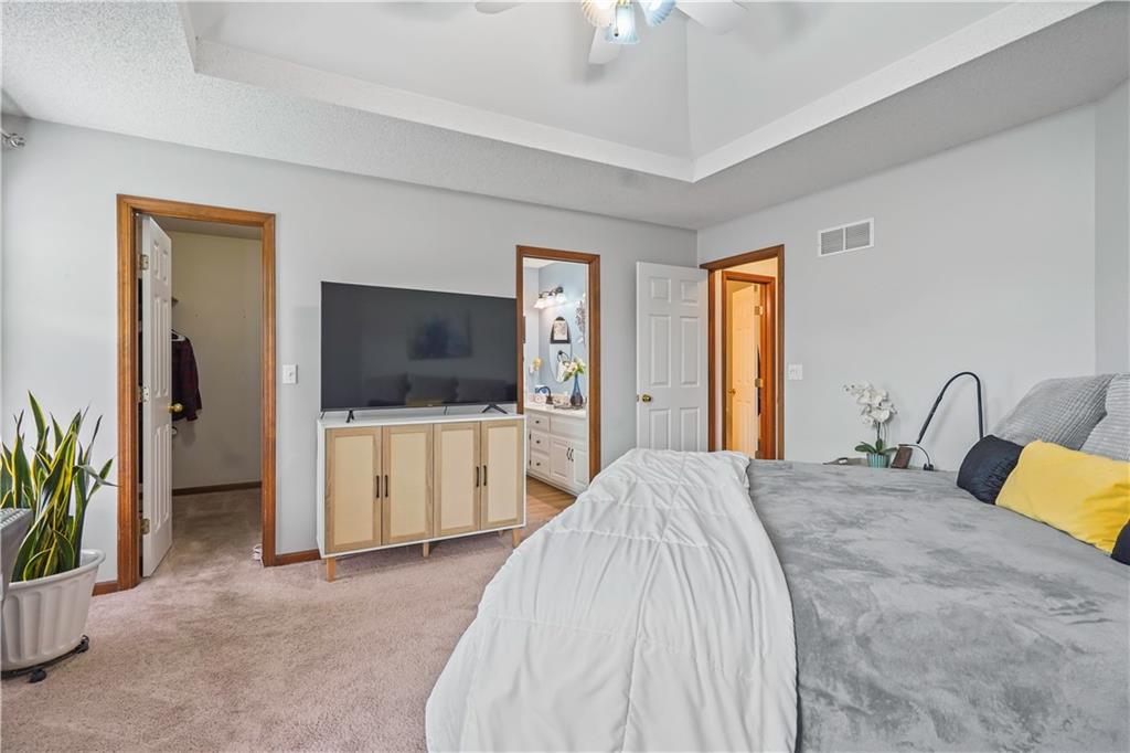 Rare opportunity for a highly sought-after floor plan on a premier fenced cul-de-sac lot in popular South Hampton! This home has been extensively updated and meticulously maintained, featuring a 2-year-old roof, newer furnace and A/C, new carpet, vinyl windows and patio door, updated light fixtures, and fresh interior and exterior paint—making it truly move-in ready. The open, vaulted main living area connects the family room, kitchen, and dining room, creating a bright and spacious feel that’s perfect for both everyday living and entertaining. Beautiful hardwood floors highlight the kitchen and dining area. The finished walkout lower level adds additional living space, while the sub-basement provides outstanding storage. Step outside to enjoy the deck and patio overlooking the private, fenced backyard! HUGE garage too! None better in this price range in south Olathe!