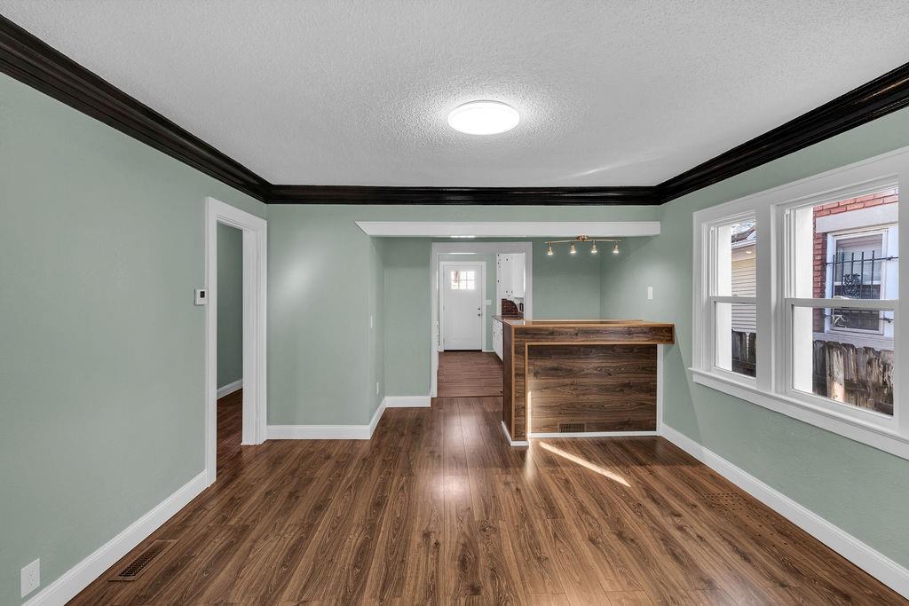 Fully renovated craftsman bungalow with charming curb appeal and thoughtful updates throughout! The covered front porch, gray lap siding, brick columns, and stone foundation give this home a classic look with fresh finishes. Step inside to find LVP flooring, dark crown molding, and recessed lighting throughout the main living areas. The living room features a brick fireplace flanked by built-in bookshelves. The updated kitchen offers white cabinetry, stone-look countertops, an exposed brick backsplash, and a breakfast bar that opens to the dining area. The bathroom has been refreshed with a tub/shower combo, glass slider door, and black hardware accents. The unfinished basement provides excellent storage or future finishing potential, with new plumbing already in place. Don't miss this move-in ready home with character and updates you won't find at this price point!