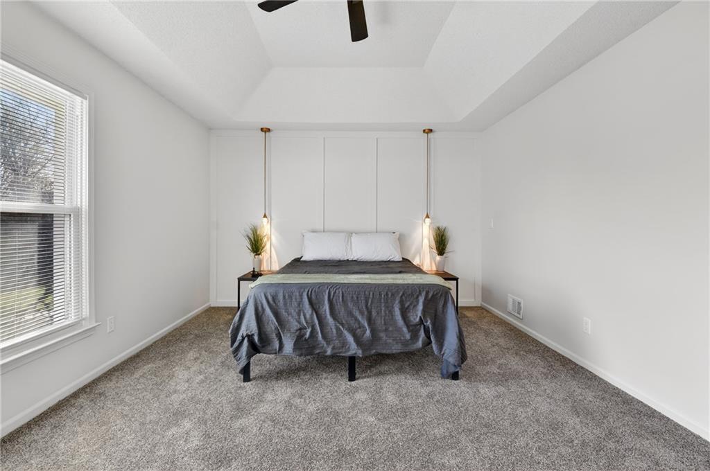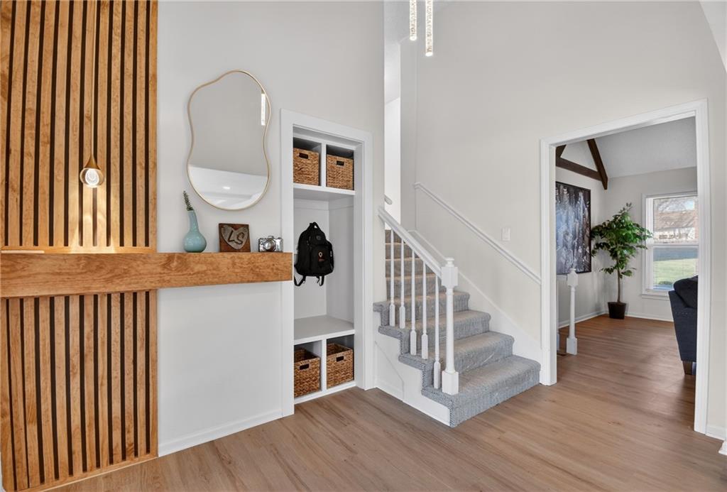 This home has been completely and beautifully remodeled with a design you are going to love, featuring bold accents and modern touches throughout. The kitchen highlights new cabinets, quartz countertops, a subway tile backsplash, and stainless-steel appliances. It is an entertainer's delight with an open concept, large central island, a breakfast eat-in space and formal dining room complete with a bold accent wall and overflow wine storage that shows as artwork. Black and gold fixtures add a stylish modern appeal, and the beautiful light fixtures throughout the home complete the updated look. You will love the foyer entrance with beautiful accent wall, built in storage and bench, and modern chandelier. The main level has a great formal room with gas starter fireplace, a vaulted ceiling, and walk out to a covered patio. Upstairs are three bedrooms and two full baths, including a HUGE primary bedroom. The ground level features a fourth bedroom on the same level as the garage, along with laundry and a half bath. The basement includes a third full bathroom and large finished space with unlimited possibilities. There is three hundred plus sq feet of unfinished storage space as well. A NEW HVAC in May 2023 will have you living in comfort for years to come. Exterior features including vinyl siding, thermal windows, a cute shed, and a large corner lot make this home a must see. Book your tour today!