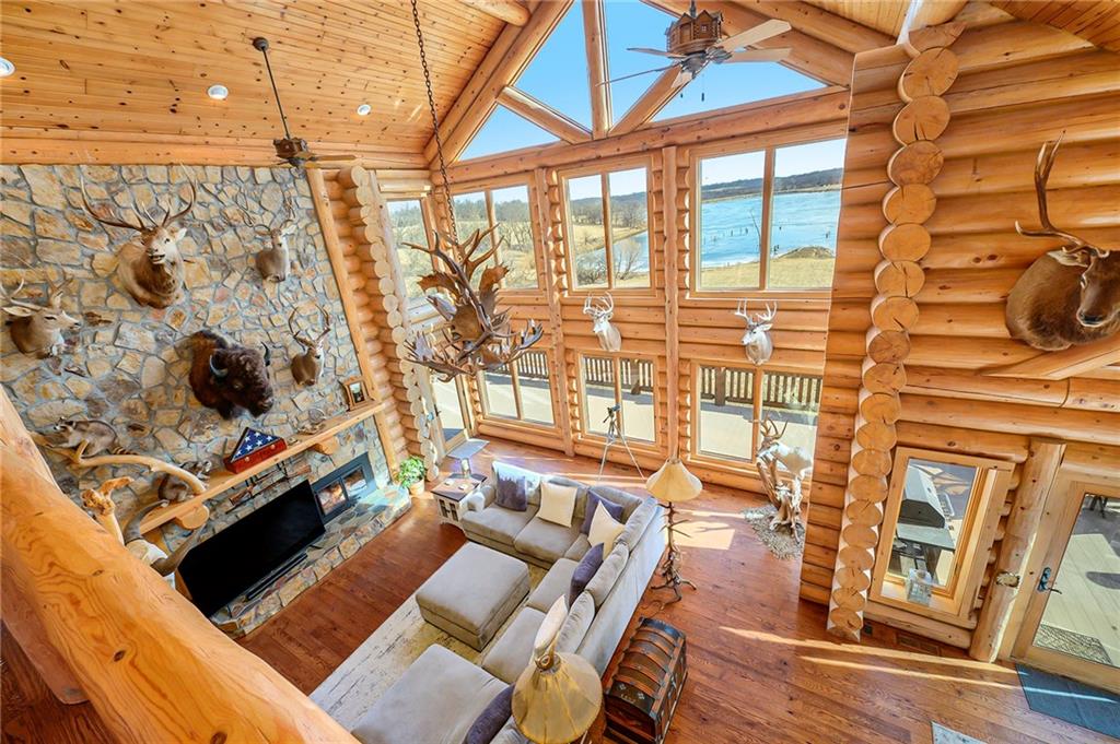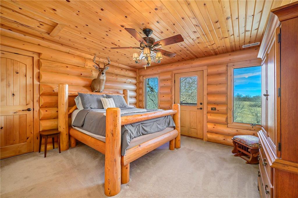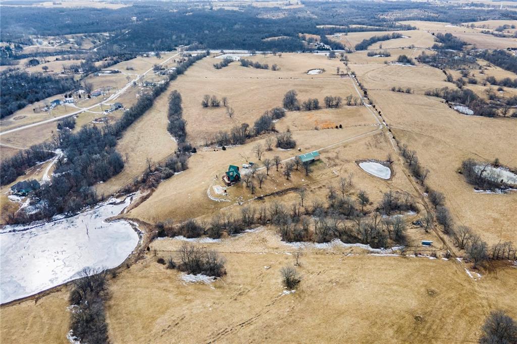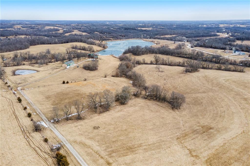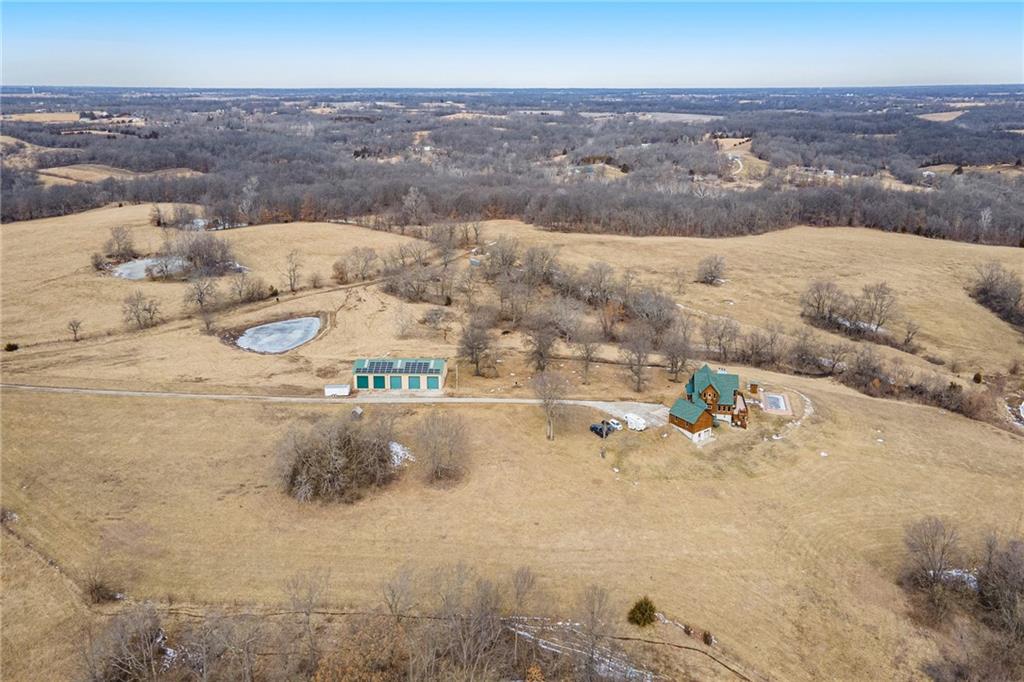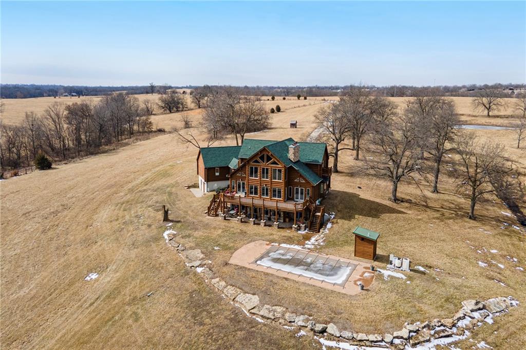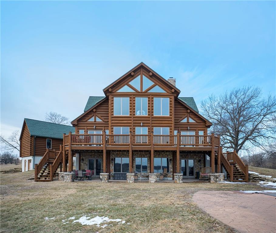 STUNNING CUSTOM LOG HOME located on 67+/- acres FULLY FENCED & cross fenced featuring a GORGEOUS LAKE!! 40x98 OUTBUILDING & lean to w/solar panels. PASTURE GROUND for your LIVESTOCK & HAY PRODUCTION along with timber. This RURAL RETREAT offers loads of RECREATIONAL OPPORTUNITIES for you and your family! The 4 bedroom 4.5 bath home offers an OPEN PLAN perfect for entertaining! CHEF'S KITCHEN features HUGE ISLAND, granite tops, CUSTOM CABINETS w/roll outs, pantry, dining space & more! SOARING CEILINGS & so many windows to take in the VIEWS! Main level primary suite w/SITTING ROOM & BEAUTIFUL STONE FIREPLACE! Don't miss the spacious laundry and mud room space for convenience. The upper level has 2 SECONDARY BEDROOMS with their own PRIVATE BATHS, walk in closets and balconies. The LOFT SPACE overlooks the EXQUISITE GREAT ROOM, STONE FIREPLACE and WALL OF WINDOWS! Finished walk out LL has the 4th bedroom & full bath, 16x8 SAFE ROOM, bonus room, REC ROOM W/3RD stone fireplace and WET BAR and 2 storage spaces. RELAX and watch the SUNSETS & WILDLIFE from the low maintenance deck overlooking the SALT WATER IN GROUND POOL & LAKE! This is a ONE OF A KIND meticulously maintained property 30 minutes from Kansas City. Square footage, acreage, schools, taxes, etc are approximate...buyer and buyer's agent to verify